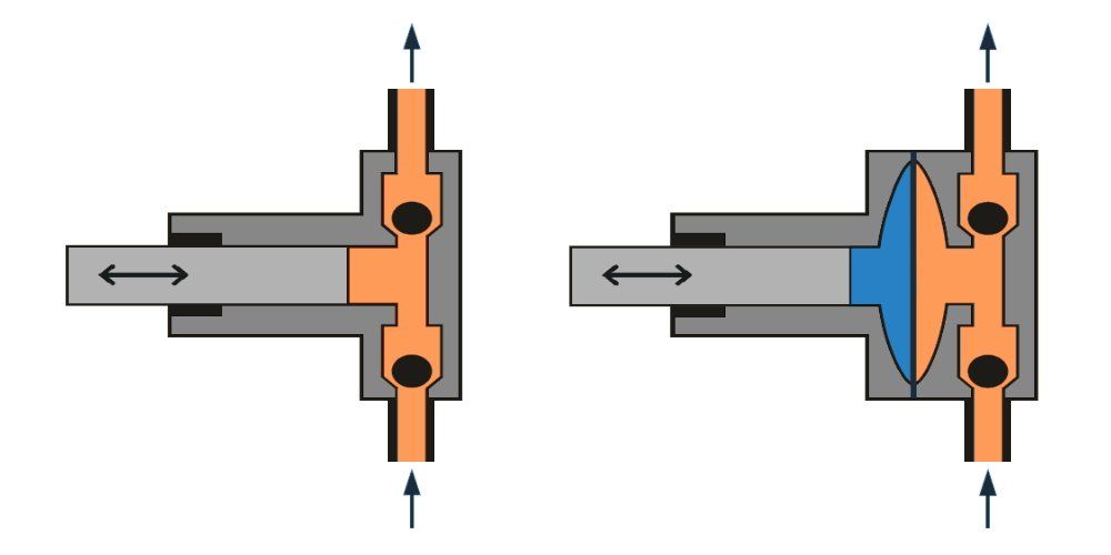 Las bombas de desplazamiento positivo solo funcionan en un sistema cerrado. En consecuencia, se necesitan válvulas o aletas (por ejemplo, válvulas de retención). El principio de funcionamiento de la bomba se basa en el desplazamiento mecánico del líquido por medio de un componente desplazador (por ejemplo, pistón). Este tipo de bomba suele ser autocebante. Esto significa que incluso las bombas diseñadas para líquidos pueden suministrar gases durante un período de tiempo muy limitado y, por lo tanto, pueden generar un vacío suficiente para la succión.